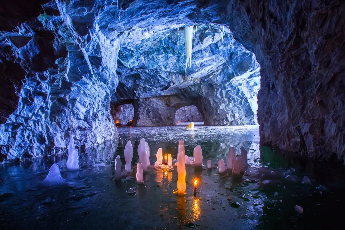 Закончим день мы посещением горного парка «Рускела». Особое внимание уделим Мраморному каньону – озеру с родниковой водой, обрамленному мраморными берегами. Ранее тут велась добыча декоративного камня, используемого для отделки Эрмитажа, Исаакиевского собора и прочих великих строений. Зимой при наступлении сумерек включается цветная подсветка.