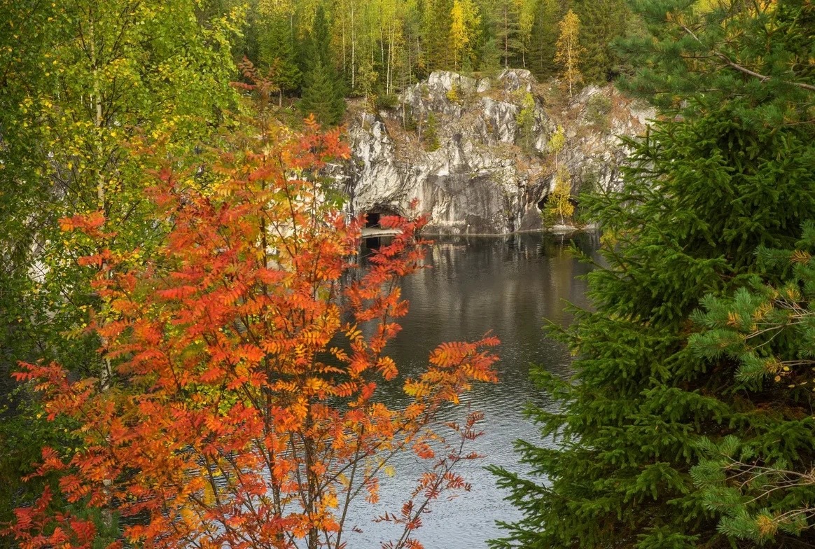 - 15:00 – парк «Рускеала». Вы погуляете по лесам мимо озер, скал, холмов. Обязательно выйдите к Мраморному каньону, где добывался декоративный камень для украшения архитектурных памятников Санкт-Петербурга, Москвы. Сейчас же каньон – озеро, берега которого из мрамора. Удивительное зрелище, которое усиливается в холодное время года при наступлении сумерек художественной подсветкой.