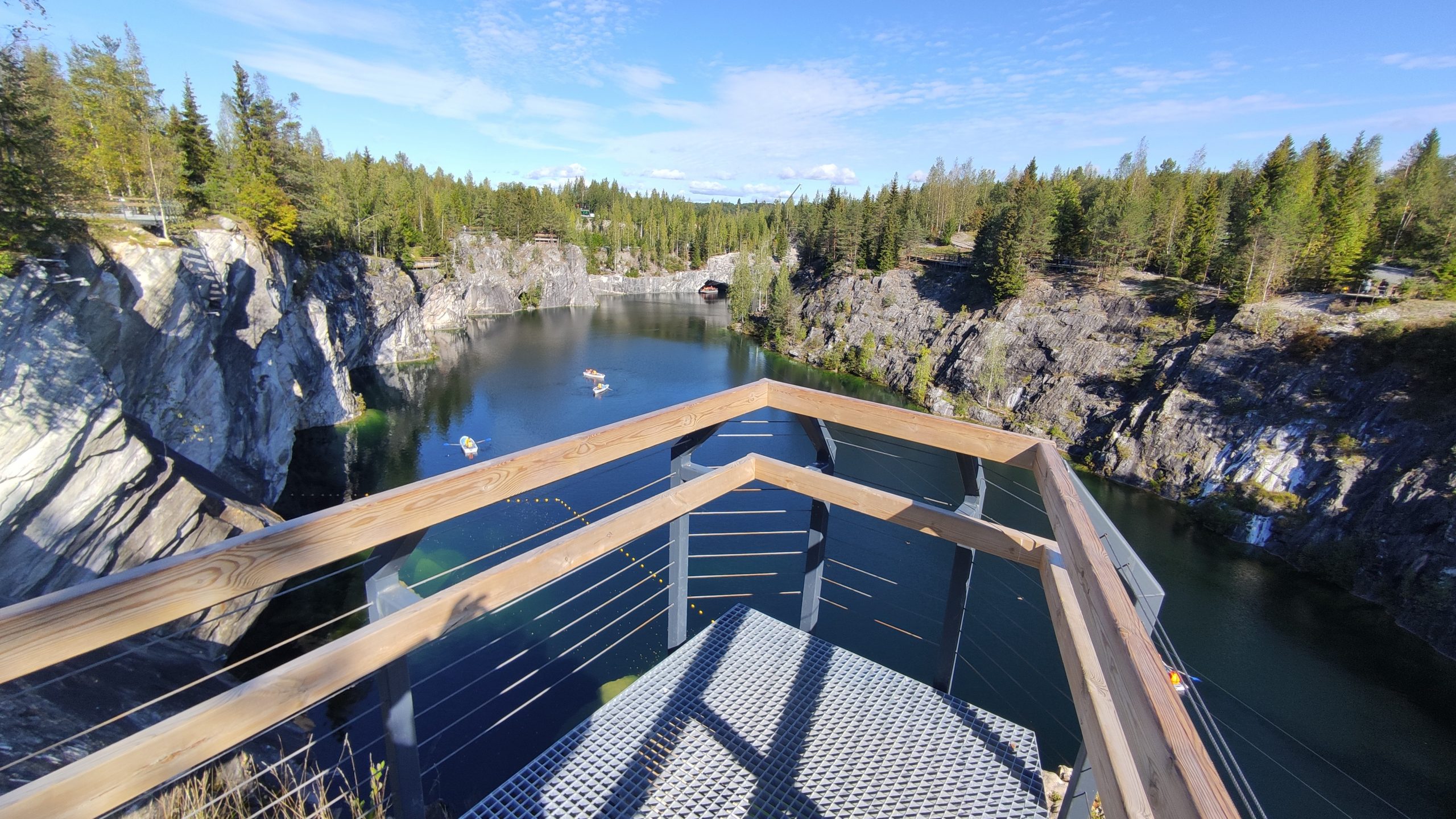 Далее мы посмотрим на другой мраморный карьер – Рускеала 2. Сюда почти не заходят туристы, вы тут не встретите магазинов, ограждений и прочей инфраструктуры. Добыча мрамора велась в советское время, о чем свидетельствует оставшийся террикон из кусков материала. Только в этой части парка вы найдете мраморные каньоны, поскольку под действием осадков происходит размытие мраморных плит. Осмотру Рускеалы 2 мы уделим более 40 минут.