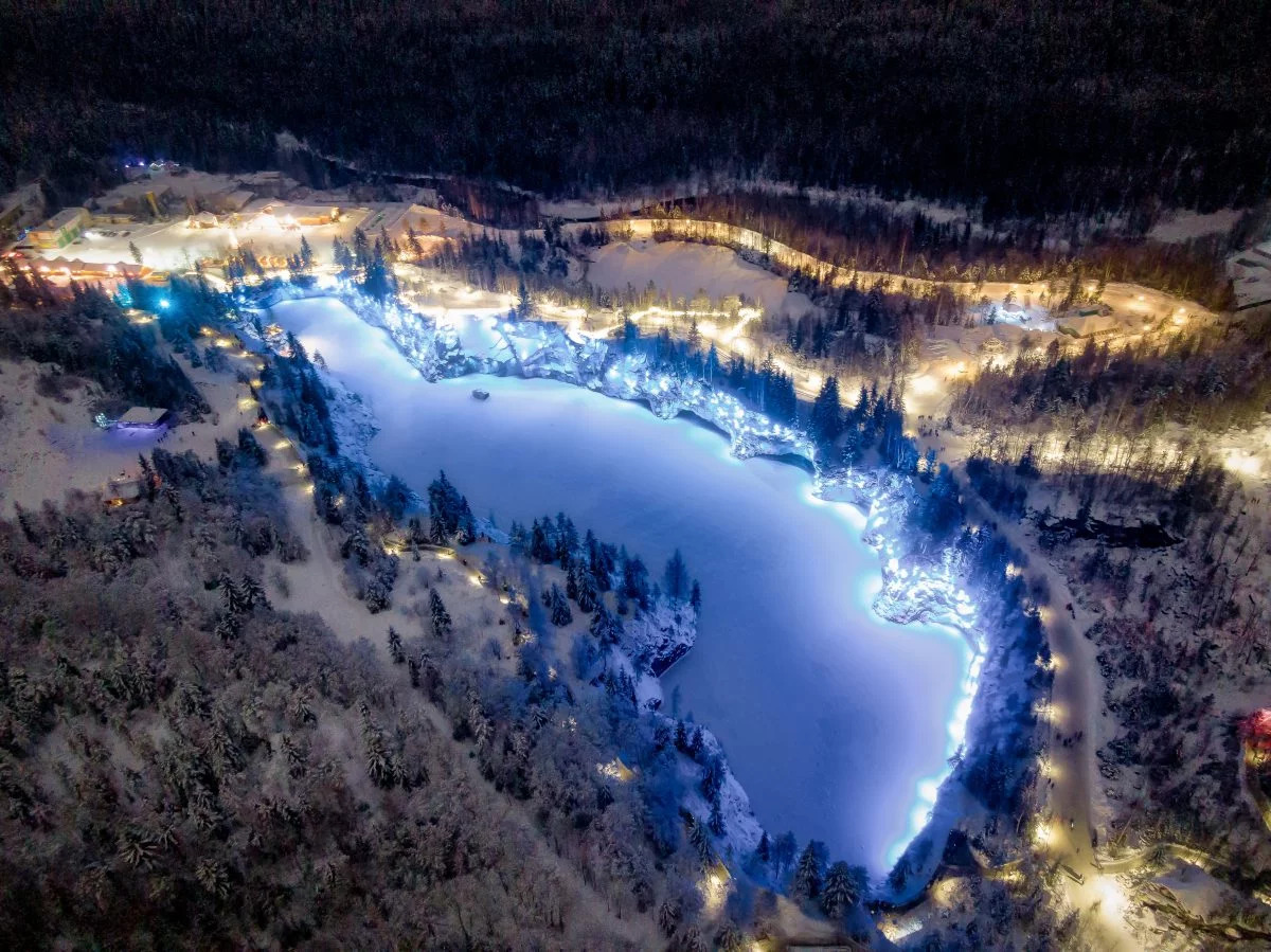 Вне зависимости от сезона горный парк «Рускеала» поражает своей красотой. На изучение парковой зоны потребуется ни один час. В первую очередь, вам будет показан Мраморный каньон. Ранее это было место добычи красивейшего мрамора, который использовался для отделки петербургских архитектурных шедевров, сейчас же здесь образовалось озеро. Мраморный отвесные берега вместе с хвойными деревьями, окружающими каньон, создаются ощущение волшебства, усиливающееся в темное время суток зимой после включения цветной подсветки.